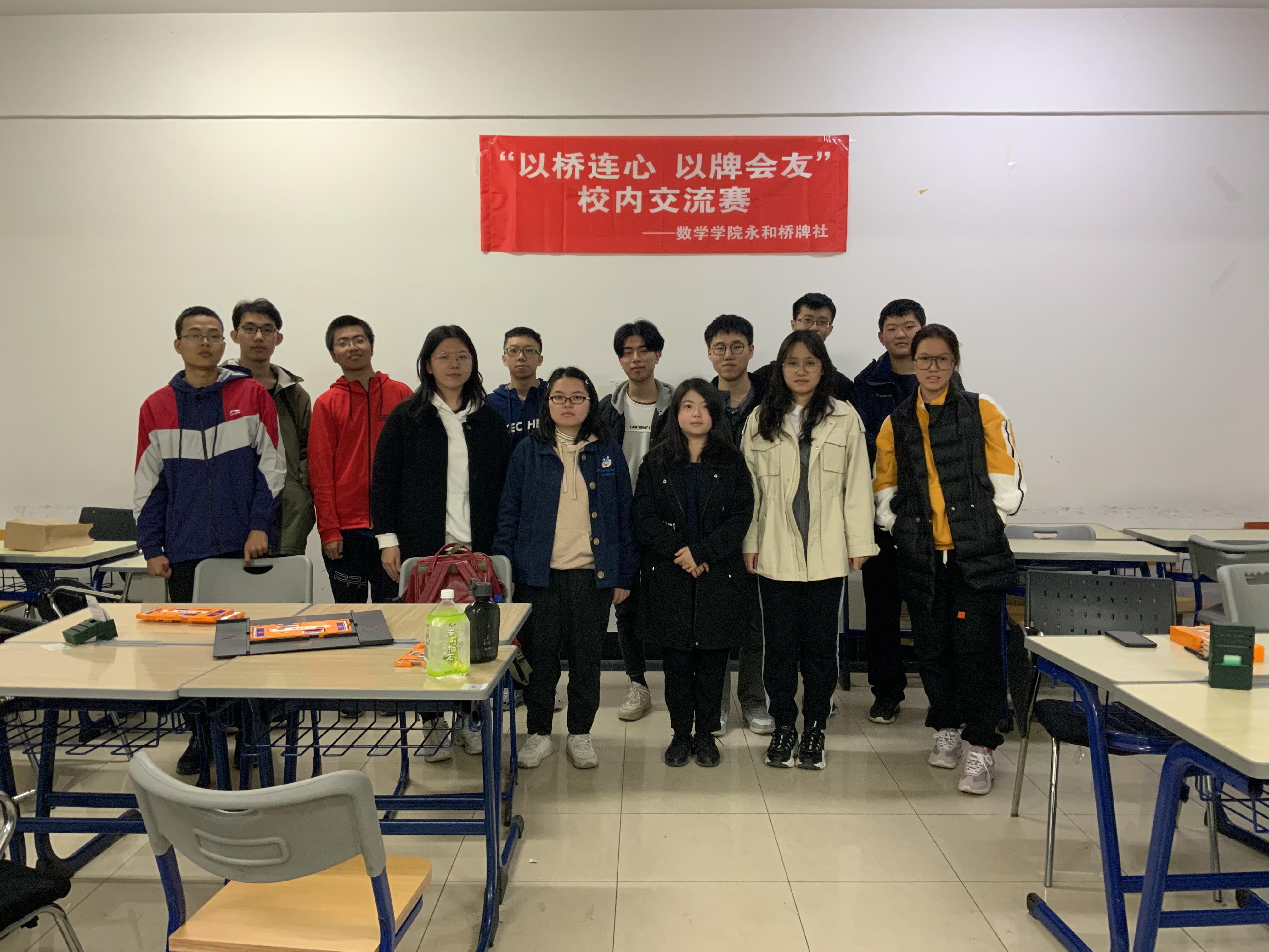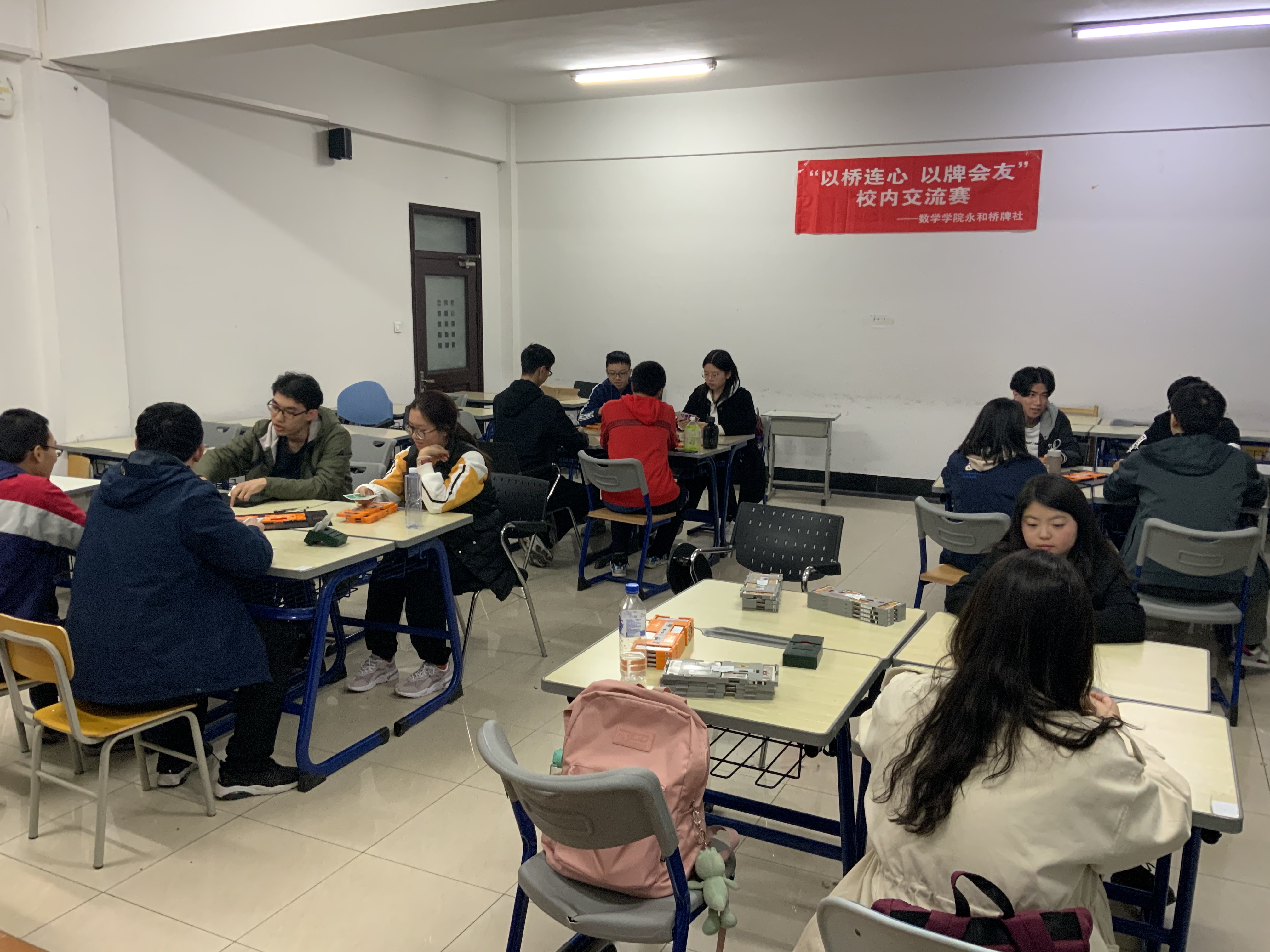 永和桥牌社在经信教学楼A105教室举办了“以桥连心 以牌会友”校内交流赛,其中,参赛选手不乏来自我院的本科生、硕博研究生及其他学院的桥牌爱好者。此次比赛采用计分制,共制24副牌,七组队伍打完24副牌后比较最终得分,分高的队伍获胜。