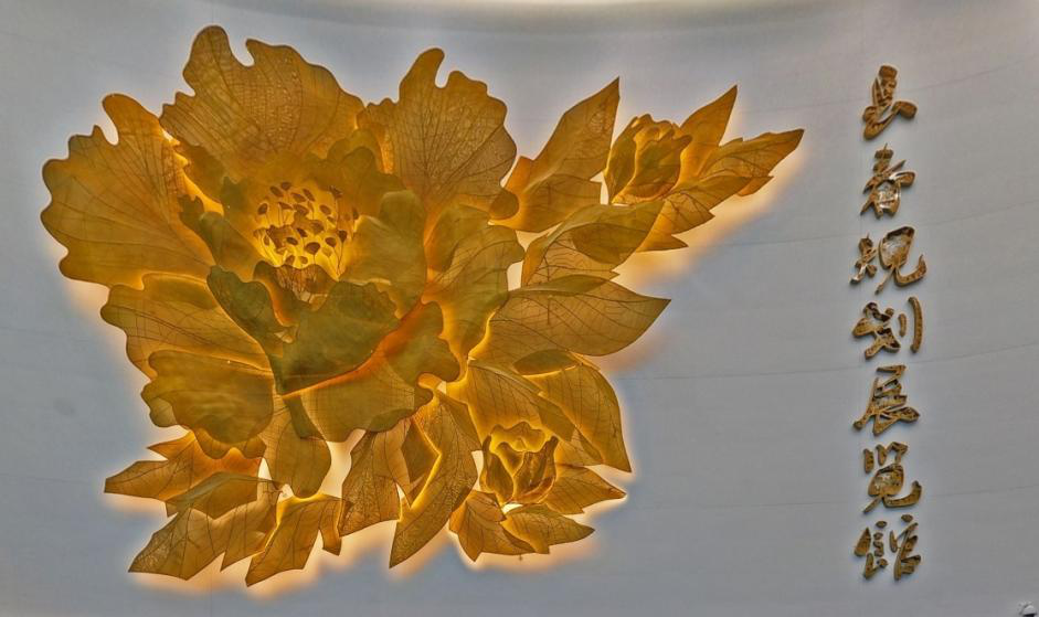 首先映入眼帘的是规划馆的“城市之花”,蕴含着长春规划展览馆“流绿都市中绽放的城市之花”的美名,借中华传统的写意韵味,以金色的一朵大花和两朵小花诠释了长春的主城区和九台区、双阳区现代化都市圈的繁荣,并以热情洋溢的盛放姿态表达了长春城市发展的强烈生命力,充分展现了“宽容大气、自强不息”的长春城市文化精神。