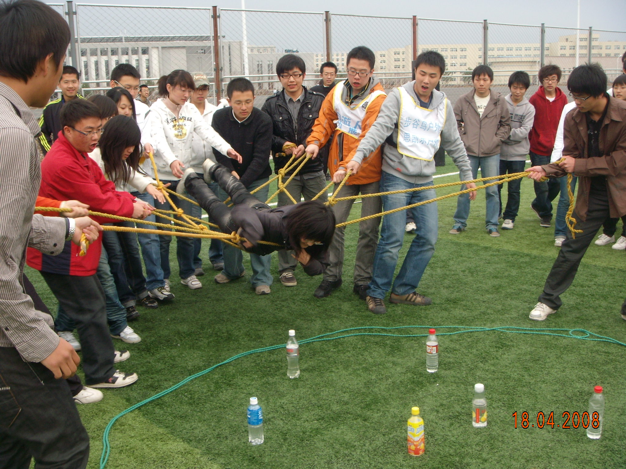 下午一点,活动正式开始。来自四个学院的同学自由编队,组成了十支队伍,每支队伍都设有各自的队名、队长、队旗及口号。在专业教练的带领和指导下,进行了名为“跨越雷区”、“排球击鼓”等训练。在不同类型的训练中,队员们相互讨论,消除分歧,由陌生到默契,成功的完成了一个又一个惊险的任务,使同学们沉浸在紧张而快乐的气氛中。下午五点,在两百人围成壮观的“人座圆圈”后,活动圆满结束。