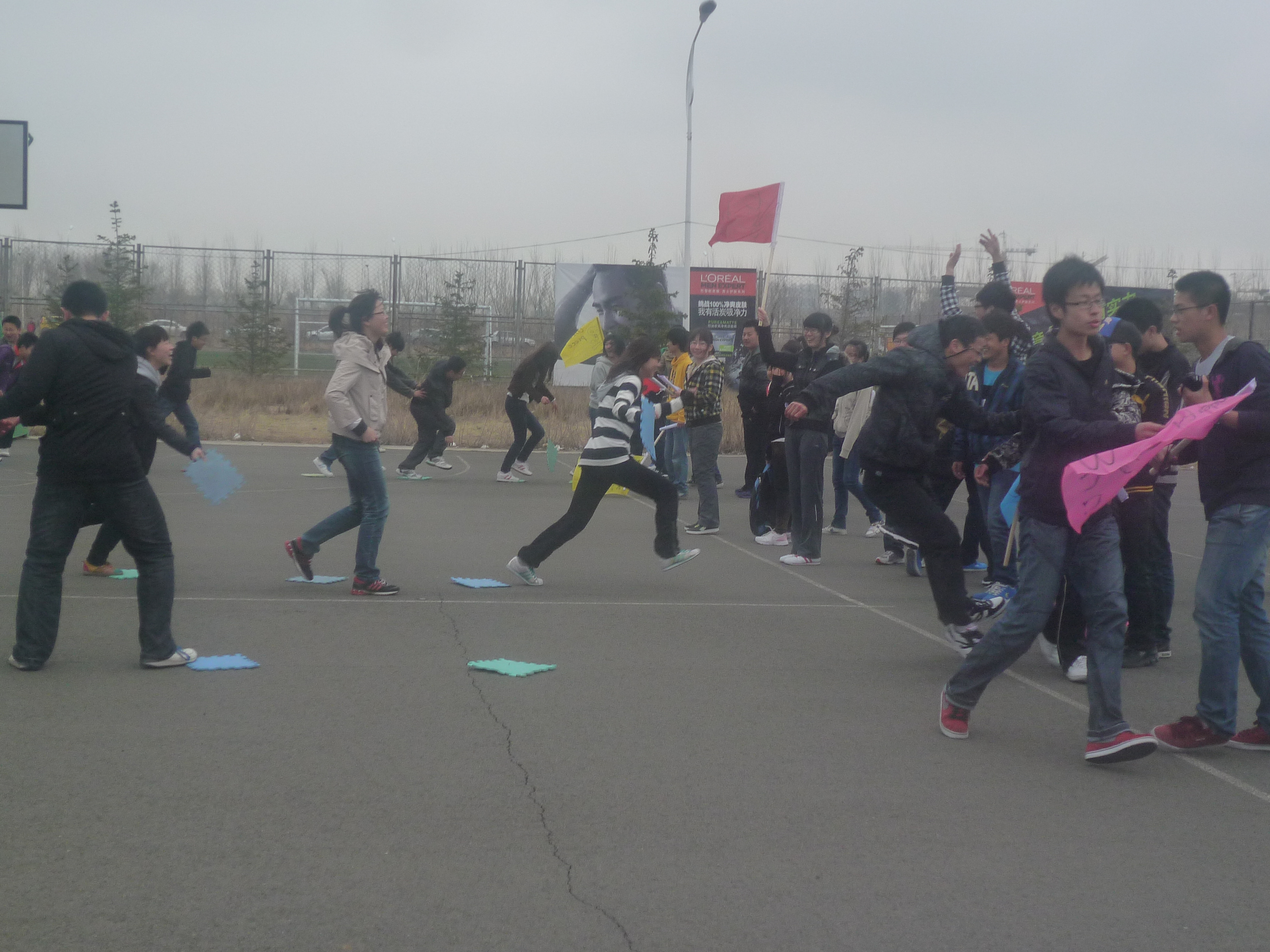 早上八点半,活动正式开始。来自三个学院的200多位同学自由编队,组成了八支队伍。活一个接一个的开始展开,共分五个环节“旗人旗事”、“爱的抱抱”、“袋鼠跳”、“搭桥过河”、“解手链”。每个活动都趣味十足,同学们积极性也相当高,配合默契。最终活动在同学们的欢声笑语中结束。