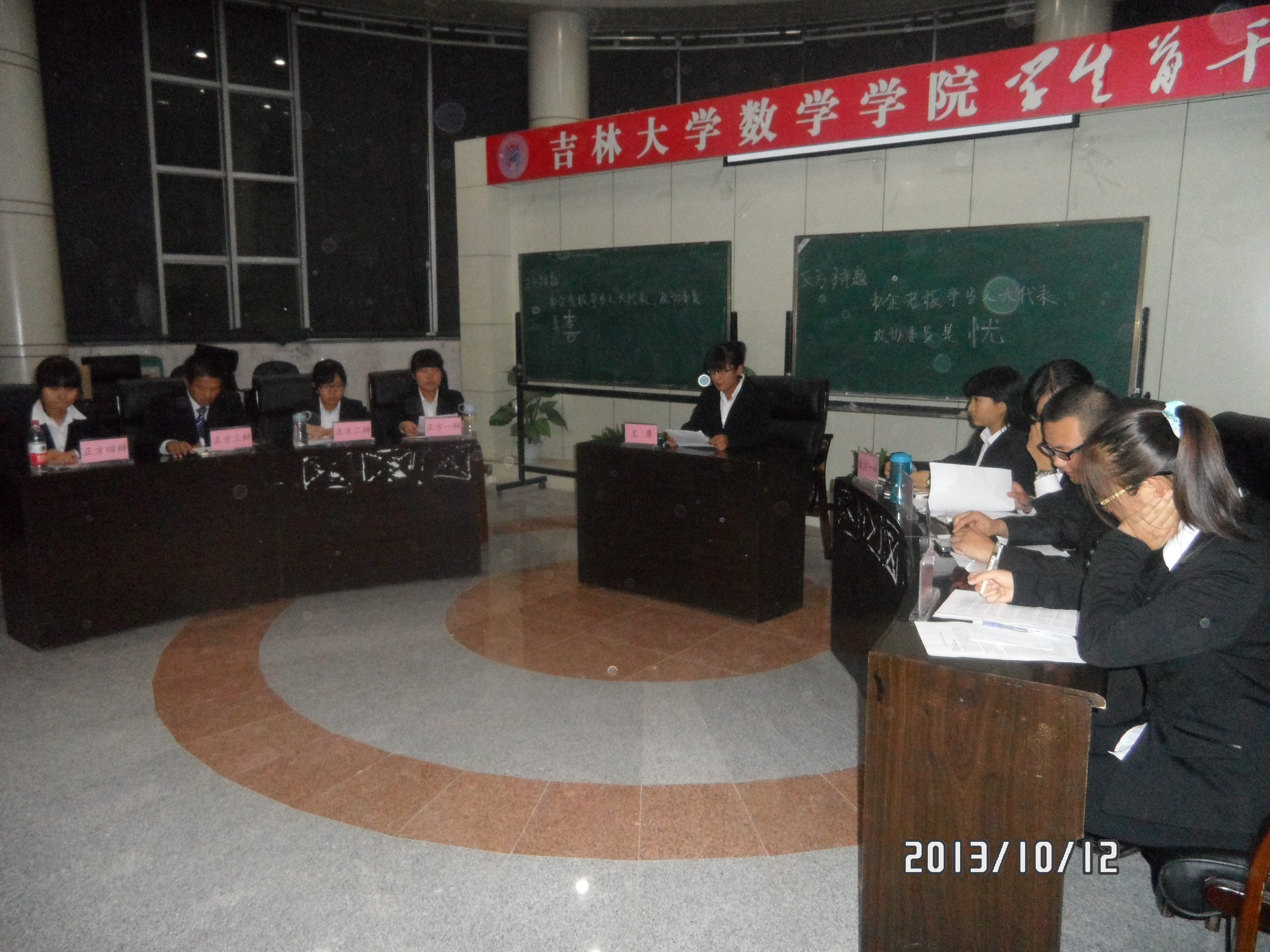 学生会学习与学术部与辩论队主办的辩论大赛,在数学楼八楼圆满举行。本次辩论赛特邀团委副书记迟仲达、社联副主席董家君、学生会学生与学术部部长王迪、2010级常务秘书长王翁正及2011级辩论队队长关博文作为本次辩论赛的评委。本次活动旨在从2013级新生中选拔优秀辩手并增进学生友谊。