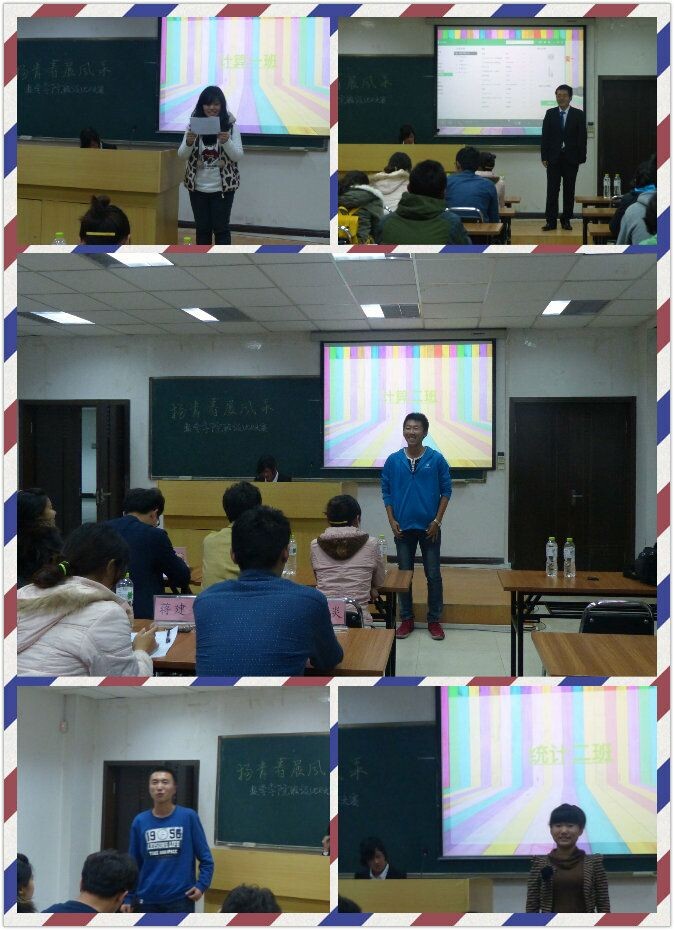 大赛在10月24日晚6点15分于数学楼一楼报告厅正式开始。首先,主持人致开场白,介绍嘉宾。而后,工作人员按照班级序号展示各班的VCR,一个班的VCR播放结束,该班代表要阐述本班创意和拍摄感想。数应一班的VCR充满青春气息,五位班委迎娶数应一班并承诺永远爱它的部分很有创意;数应二班的VCR搞笑而又真挚动人;计算一班的VCR内容丰富,中间的一串字幕呐喊出了计一同学的团结和坚强;计算二班的VCR展示出优雅火辣的青春和最简单的快乐;计算三班的VCR真实体现了同学们学习、玩耍的样子,做到了平淡是真;统计一班作品中每位同学认真说出“我爱统一,我很幸福”的模样感动了在场每一个人;统计二班的VCR详细地展示了班内每位同学的性格特点,搞笑和真情同在;唐班的VCR大气精致,一张张图片表现出最霸气的青春。