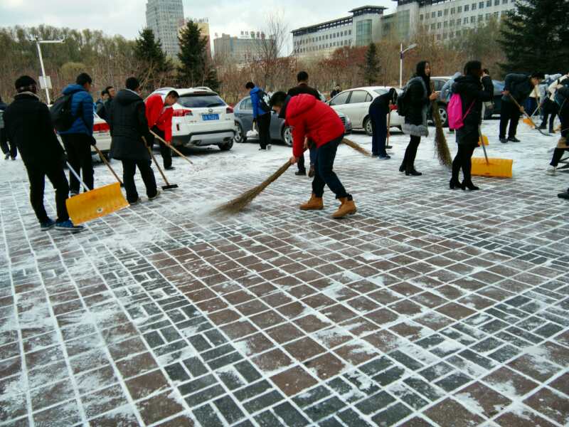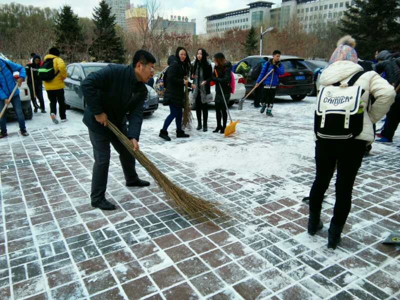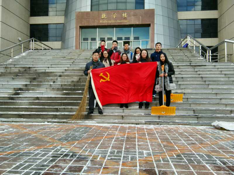 党委副书记兼副院长赵任老师,2015级辅导员崔帅老师,2016级辅导员李庚老师的带领下,14,15级党员及16级全体学生清扫了数学楼前的积雪。