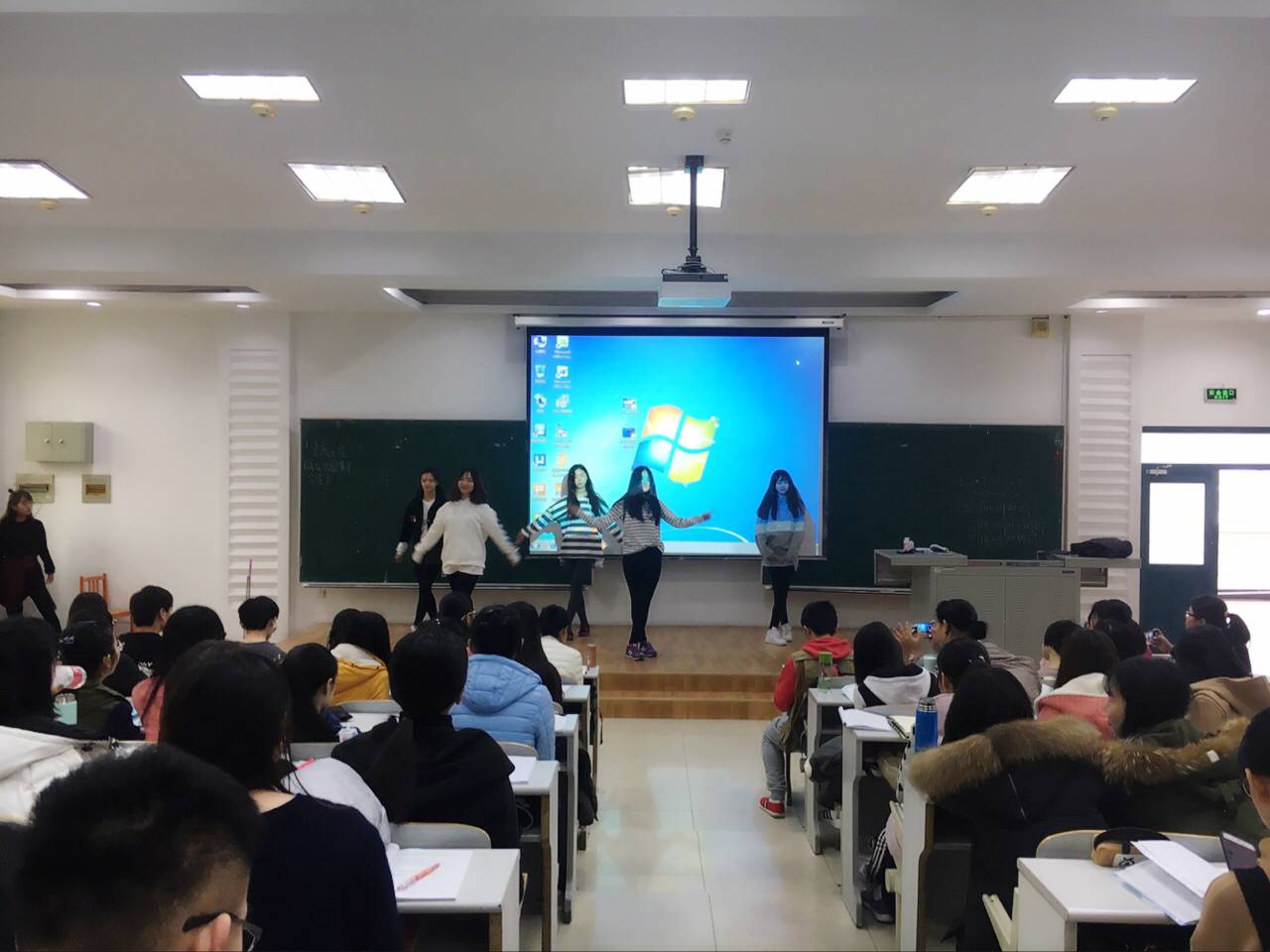 正值课间,音乐突然响起,一群活泼阳光的年轻人吸引了同学的目光,短短几分钟的热舞,带动了整个教室的氛围。在恰当的时候戛然而止,舞者们飞速退场,给同学们留下无限遐想。过了好久,同学们还沉浸在舞蹈中久久不能自拔。