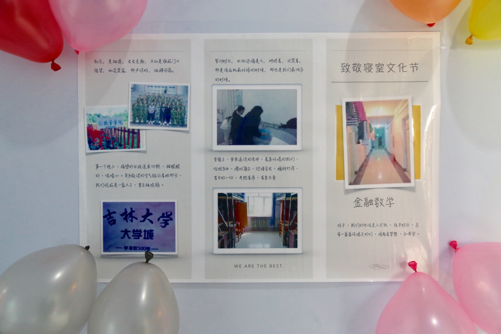 ,刚步入走廊,就已经感受到了同学们的用心,张灯结彩,五彩斑斓,让人很是欣喜,照片墙记录了开学以来的点点滴滴,更有才华横溢的同学自己手绘了海报,每一间寝室同学们都发挥自己的想象,把那一方天地布置成喜欢的模样。有的寝室以