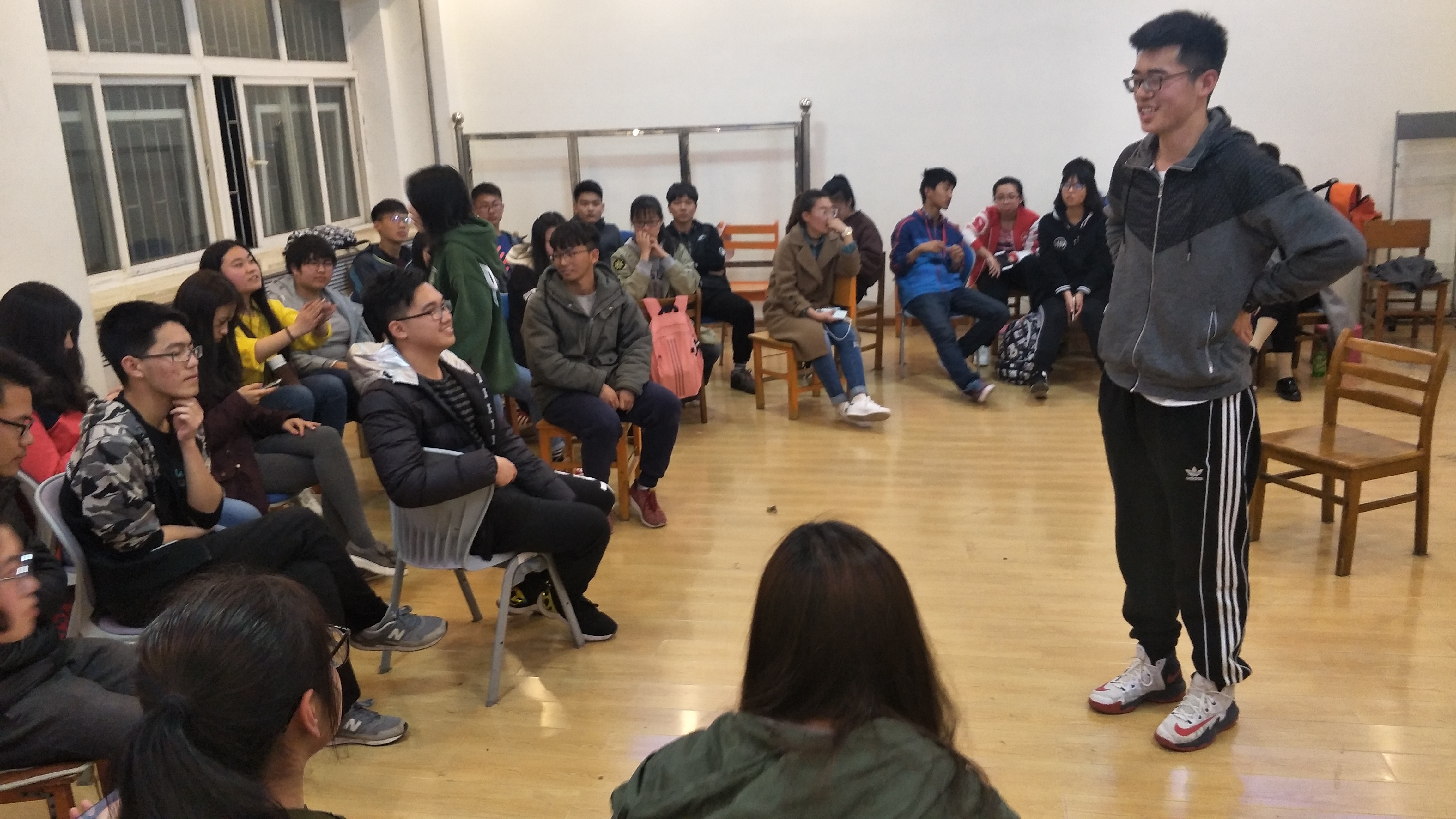 在轻松活泼的氛围中,活动拉开了帷幕。活动伊始,主持人简介了此次活动的主题与目标,并从自己开始进行简短的自我介绍。新老同学们都踊跃发言,全身心地表达。活动在大家的积极发言中迎来了第一次高潮。随后进入了游戏环节,主持人妙语连珠,同学们积极参与。暖身小游戏“你比划我来猜”,将活动又一次送入高潮。同学们在游戏中得到身心放松的同时,也无形中增进了彼此间的默契。活动氛围也更加活跃。之后进行的是“保密原则”,大家伸出拇指,相互紧握,围成一个圈。当大家一起喊出“我会保密”时,同学之间的距离仿佛更近了。最后一个环节是情景剧的表演,各组同学在激烈讨论与充分地准备之后,为全班同学呈上了精彩的表演。大家在表演与随后的分享中内化此次活动的精神。活动迎来了最后的高潮。在同学们的掌声中,此次活动圆满结束!