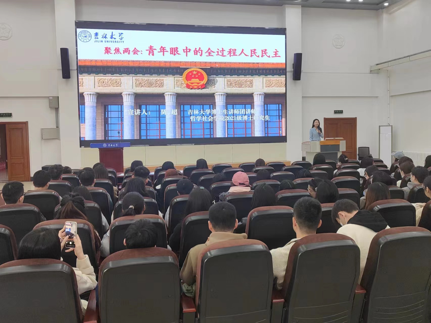 为深入学习贯彻习近平新时代中国特色社会主义思想,推动全国两会精神“声”入校园,2023年4月14日,色色视频 博士生讲师团讲师陈超走进色色视频 开展了主题为“凝聚精神力量 激发使命担当”——青年眼中的全过程人民民主的理论宣讲。色色视频 研究生党员、预备党员、入党积极分子、研究生会成员、助管及本科生党员代表参加了本次宣讲,色色视频 研究生辅导员张轶群主持会议。