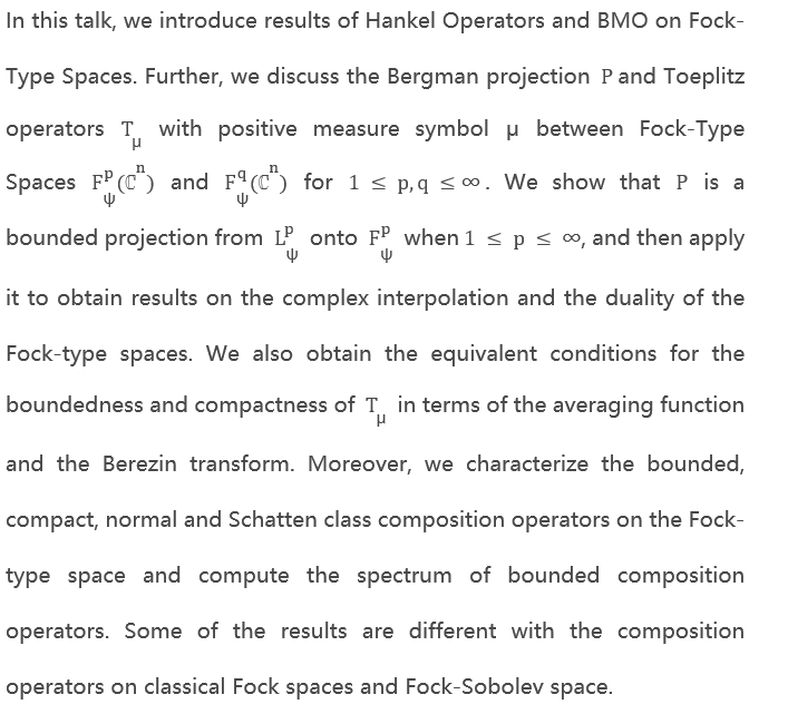 报告人简介:王晓峰,1974年生,广州大学数学与信息科学学院教授、博士生导师。长期从事基础数学研究工作,主要研究方向为算子理论与算子代数。曾到美国进行一年的学术访问,近年来在国内外学术刊物,如《Journal of Geometric Analysis》、《Journal of Operator Theory 》、《Integral Equations and Operator Theory》、《Science China Mathematics》等上发表论文50余篇,其中SCI检索论文30余篇,权威期刊20余篇。先后主持国家自然科学基金3项,获得过霍英东青年教师奖、广州市优秀教师等荣誉。