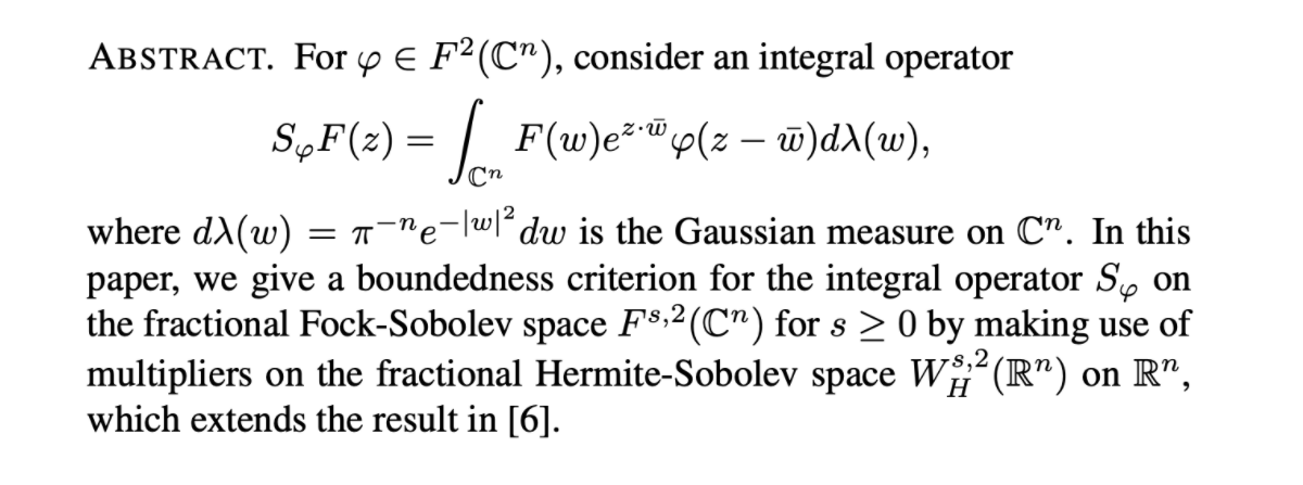 Fock空间上的任一有界线性算子可以表示为形如。本报告将介绍Fock空间上积分算子有界性研究方面的一些进展。特别是当是朱算子或系数乘子的情形。