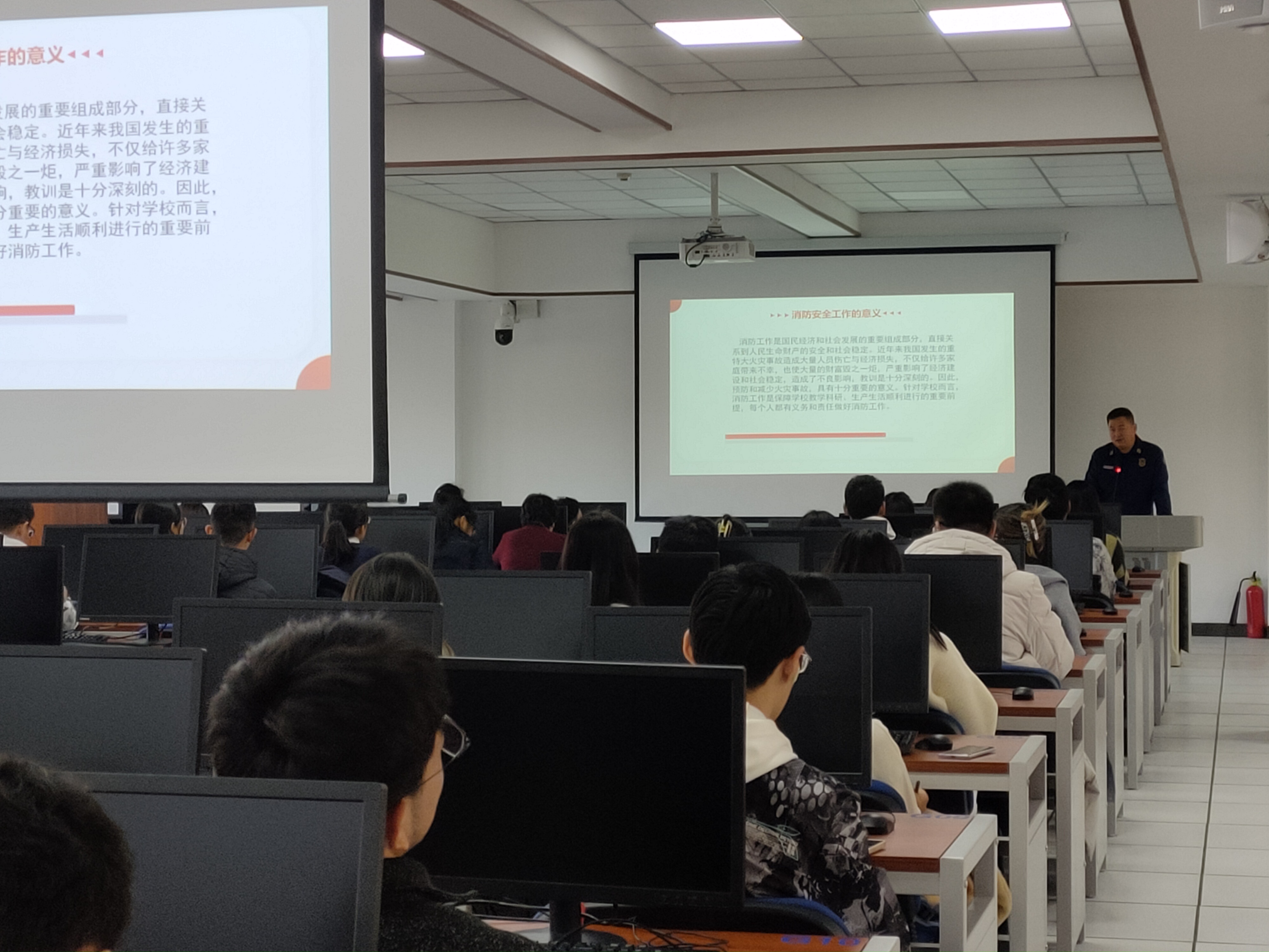 保卫处董立明老师先介绍了色色视频 消防安全管理规定,落实安全制度,强化安全管理,简明地讲述了基本的消防安全知识。然后,董老师以多起大型火灾事故为例,结合视频进行讲解,警示同学们注意不要做出违规行为,如人走不断电、在床上长时间充电等;普及火场的正确逃生办法,如湿毛巾捂住口鼻、禁止乘坐普通电梯等,同学们都受益匪浅。