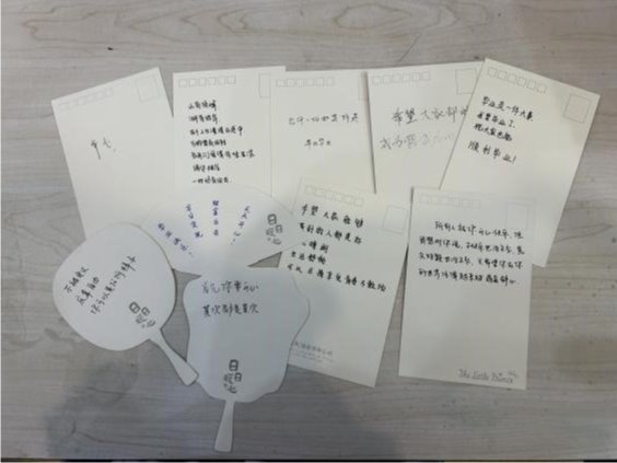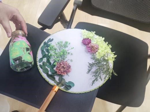 在线下环节,各学院参与活动的同学们相聚敬信教学楼心理团体辅导室。在工作人员的引导下,同学们纷纷投入到自己的创作过程中,或者拼凑积木花,或者制作手工团扇。在制作结束之后,同学们也纷纷在明信片上留下了一些祝福语,这些明信片最终一张张地缓慢地落在收纳盒里。积木花、团扇和明信片,无一不见证烦恼的倾诉、友谊的建立。