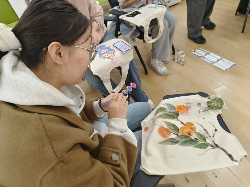 活动在下午2点准时开始,几十名来自不同学院的学生积极参与。在几个学院主办方的帮助下,学生们获得了空白帆布袋、颜料、画笔及马克笔等材料,并在帆布袋上进行了自由创作。他们根据自己的喜好设计独特的图案,使用不同颜色的颜料进行创作,最终制作出属于自己的个性帆布袋。