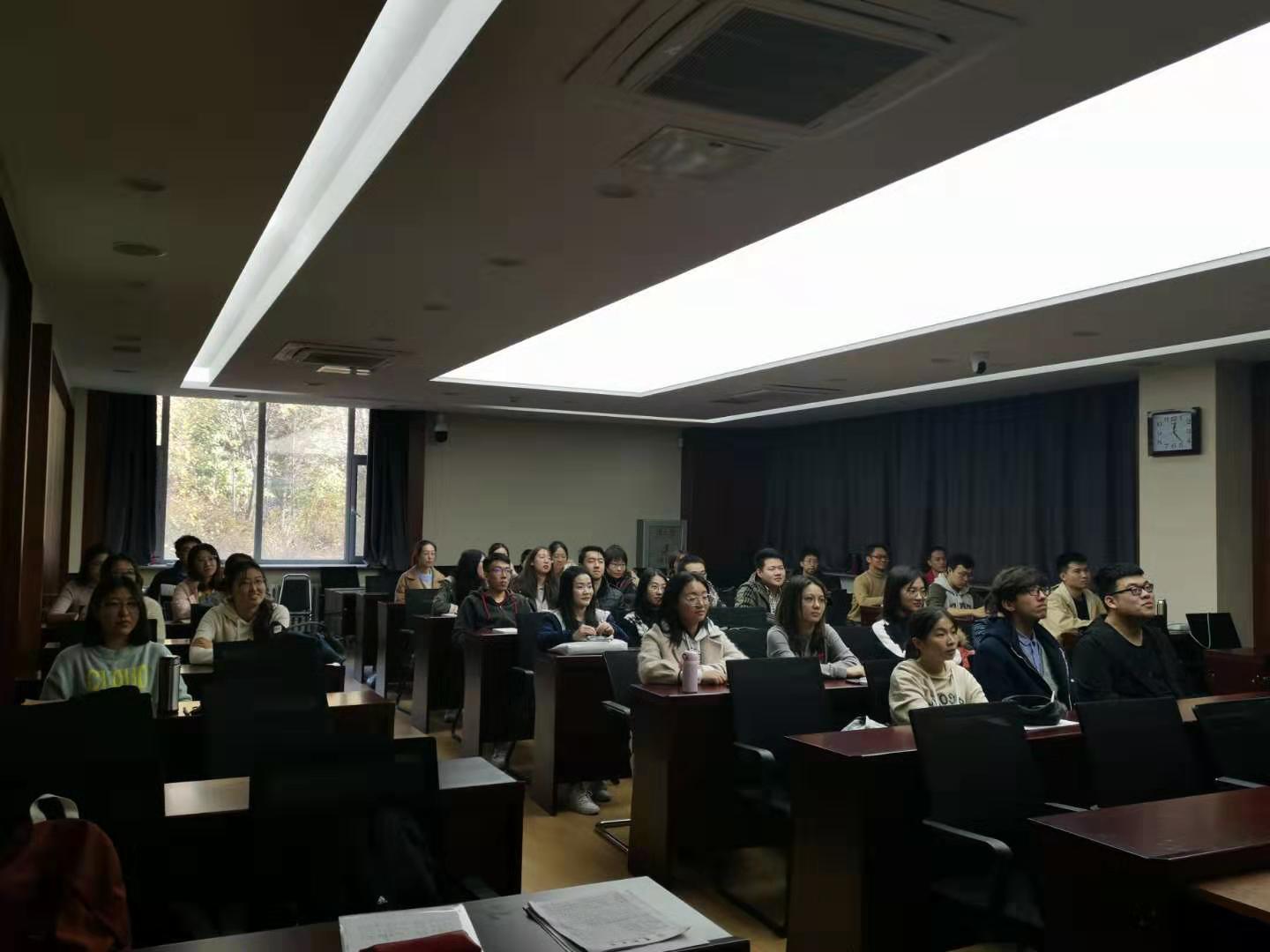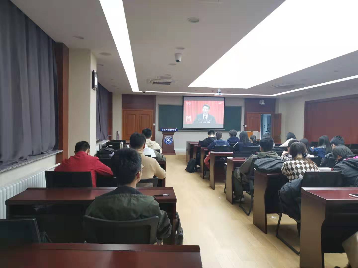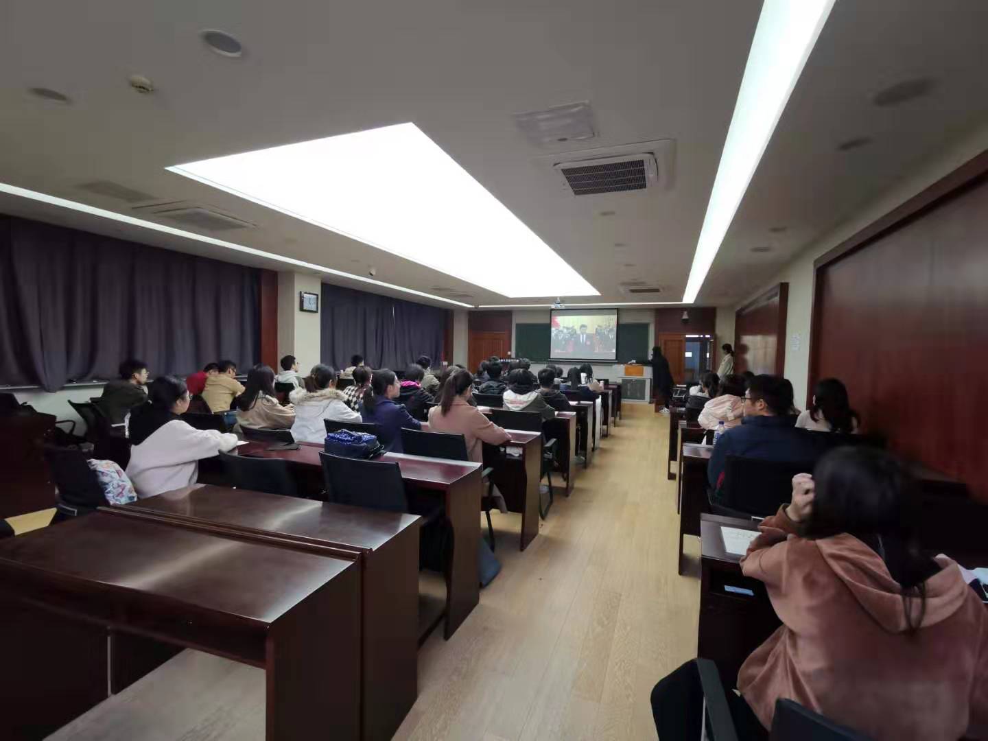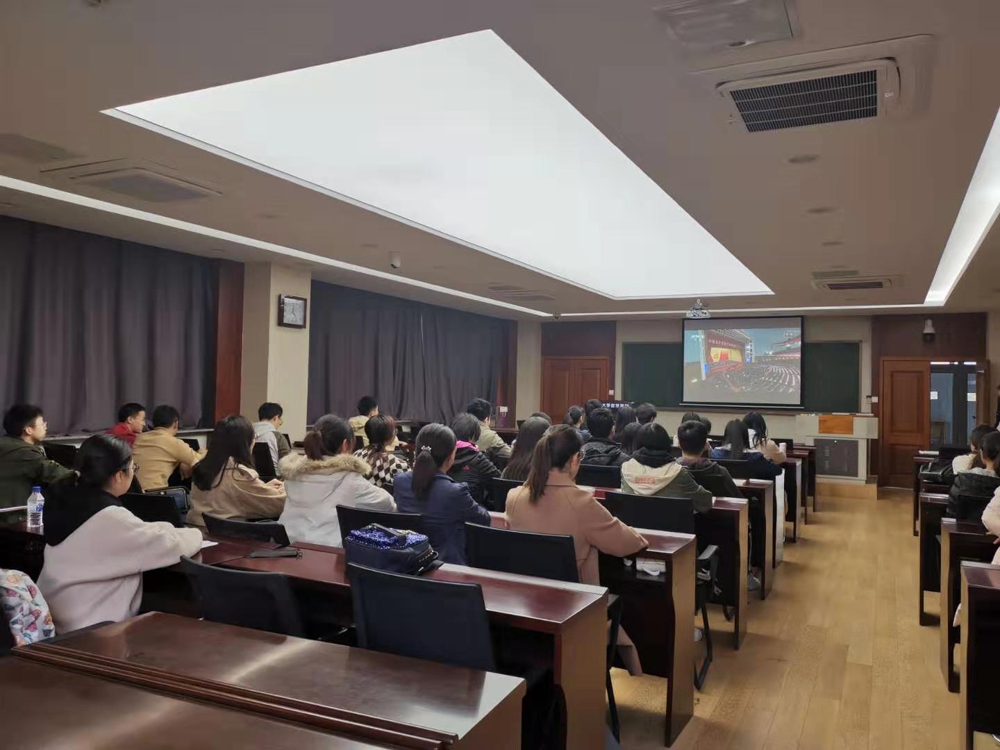 第一、第二党支部于2019年10月16日中午在数学楼第二报告厅进行“不忘初心、牢记使命”主题教育——组织集中学习观看十九大报告视频。十九大报告是党在新时代开启新征程、续写新篇章的政治宣言和行动纲领。在新时代坚持和发展中国特色社会主义,要求广大党员同志用党的十九大精神武装头脑、指导实践、推动工作,深刻认识各项战略部署的整体性、关联性、协同性,从而为全面做好各项工作夯实思想基础。