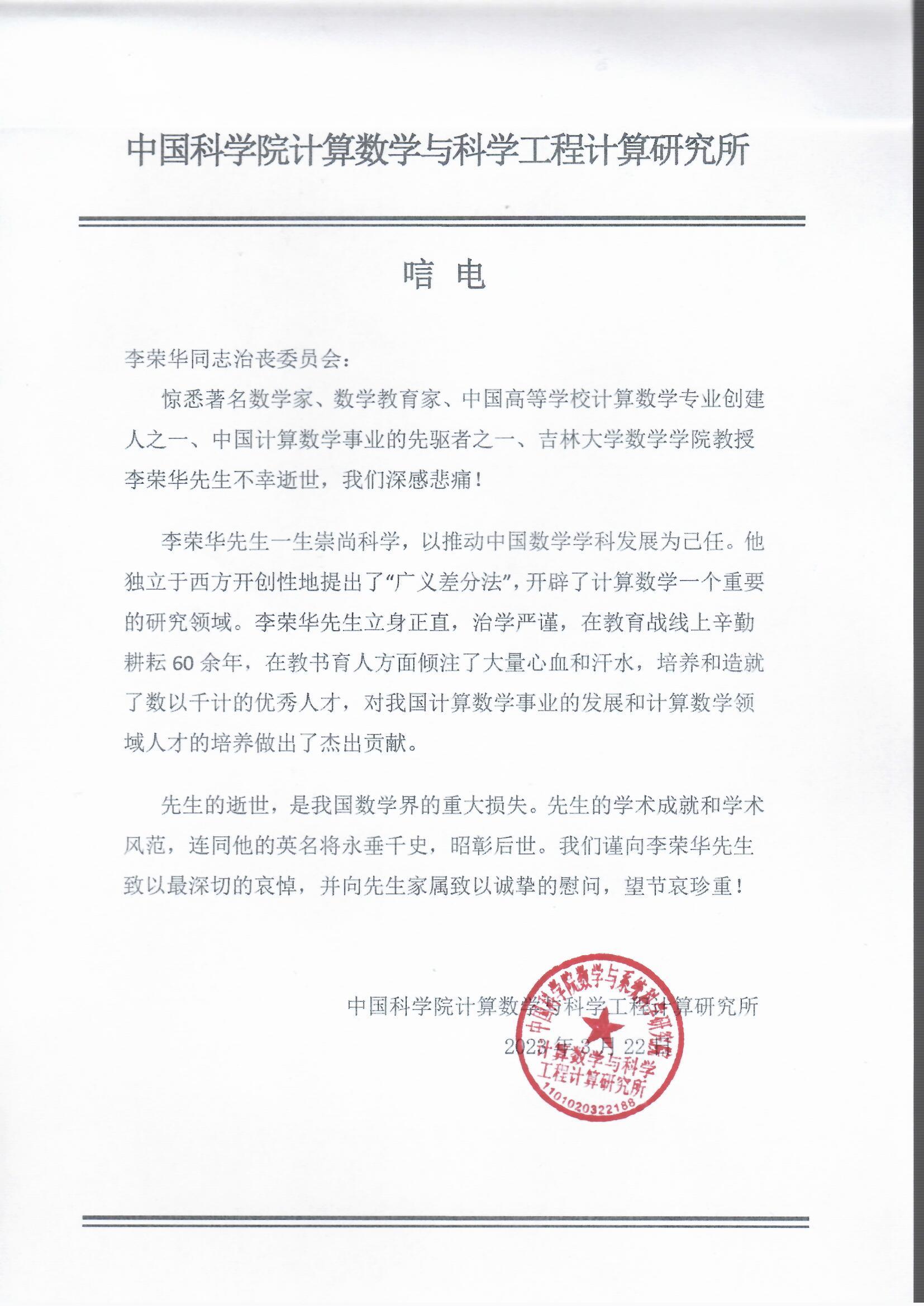 中国科学院计算数学与科学工程计算研究所唁电