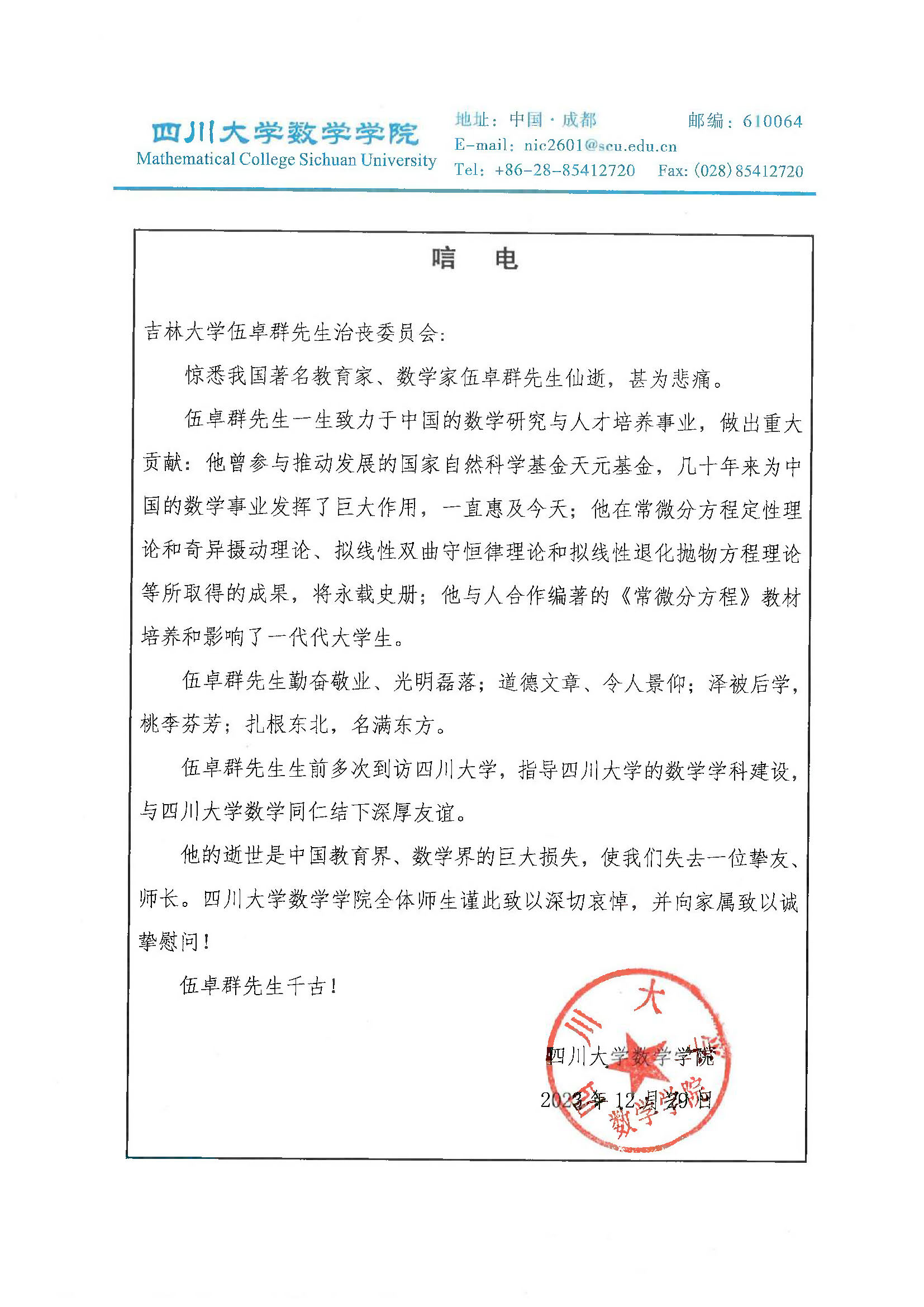 深圳大学数学科学学院唁电