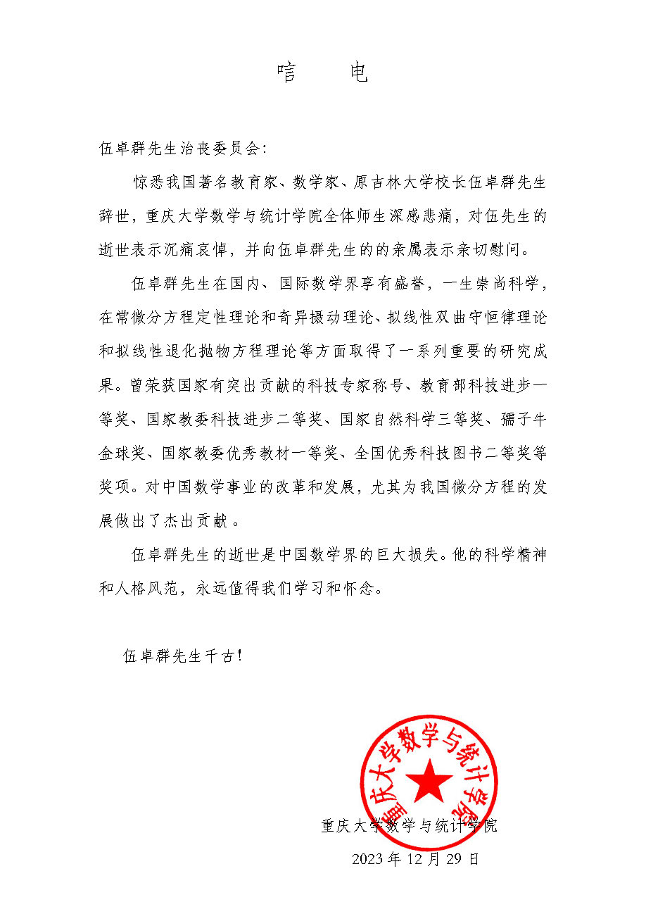 重庆大学数学与统计学院唁电
