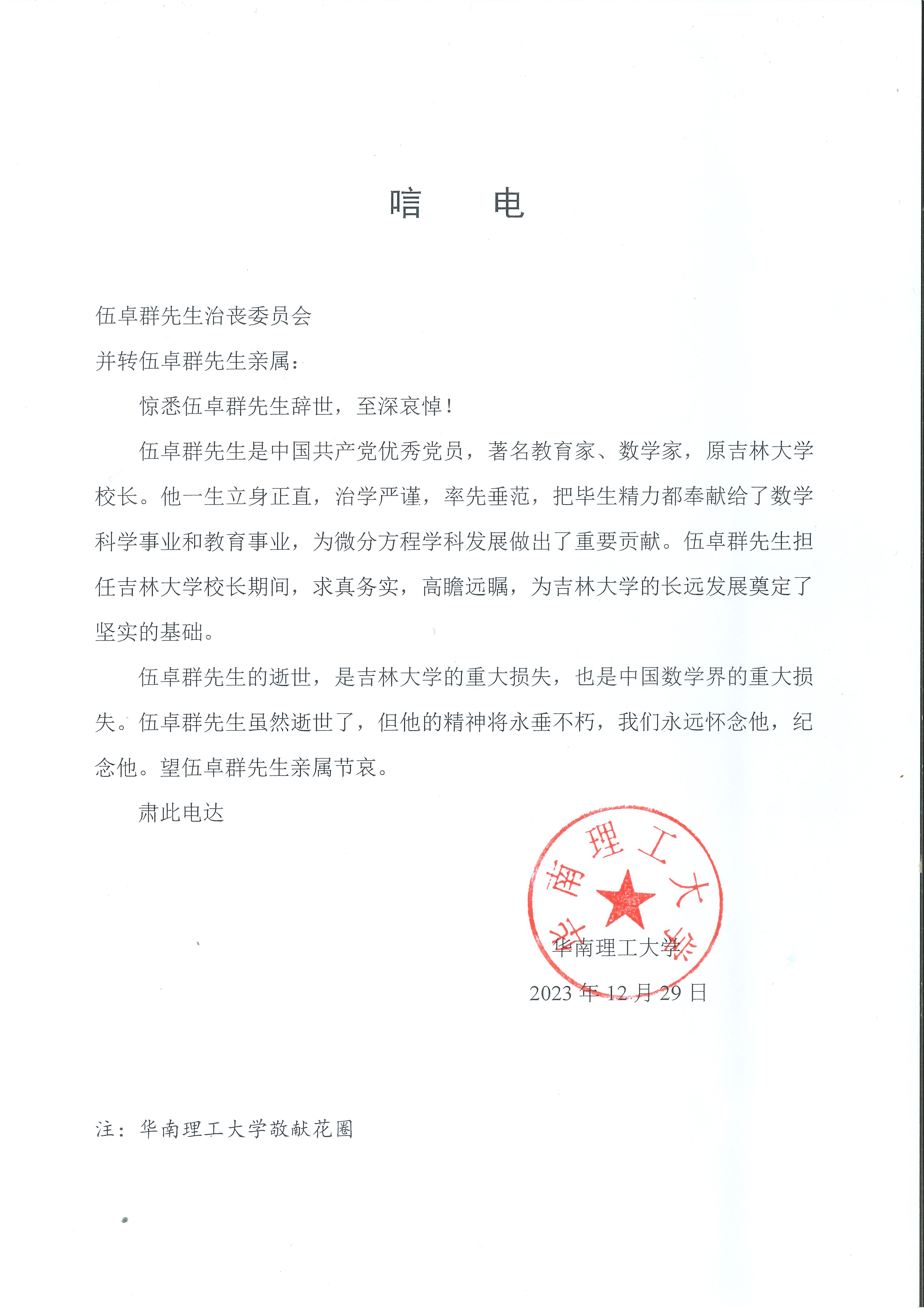 华南理工大学唁电