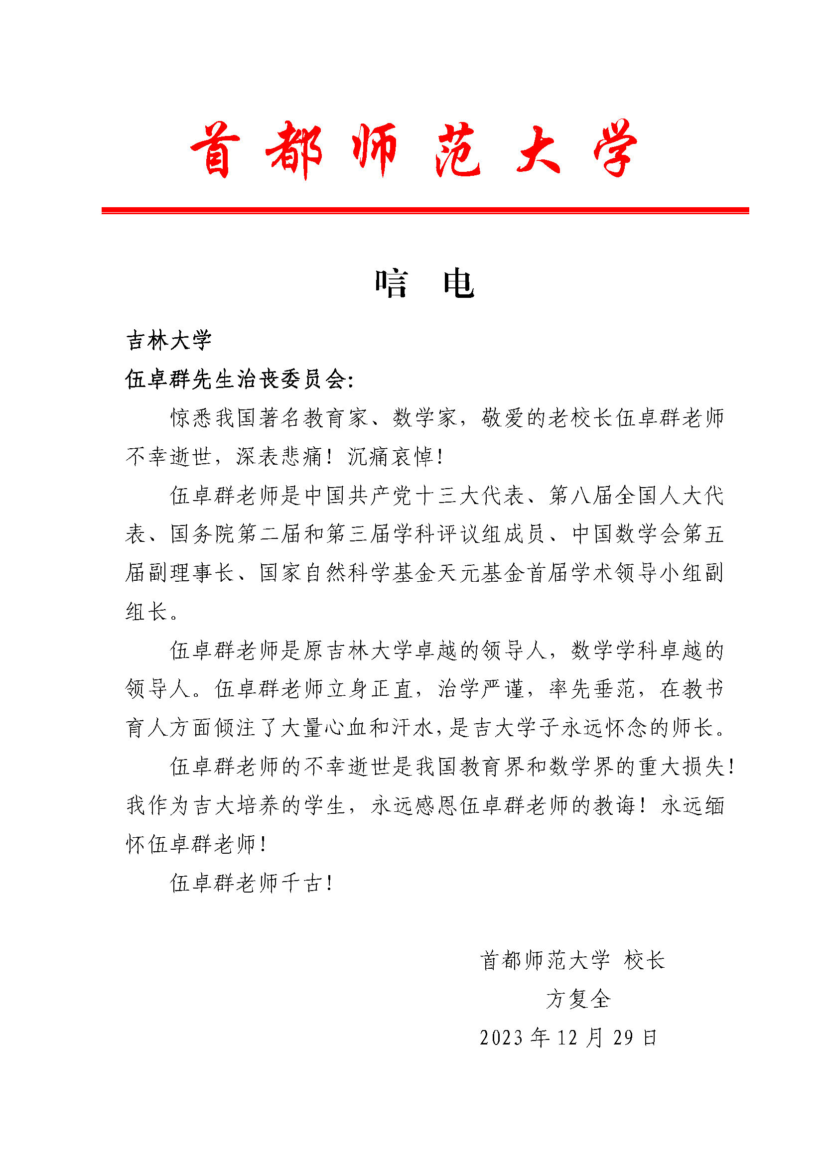 首都师范大学校长方复全院士唁电