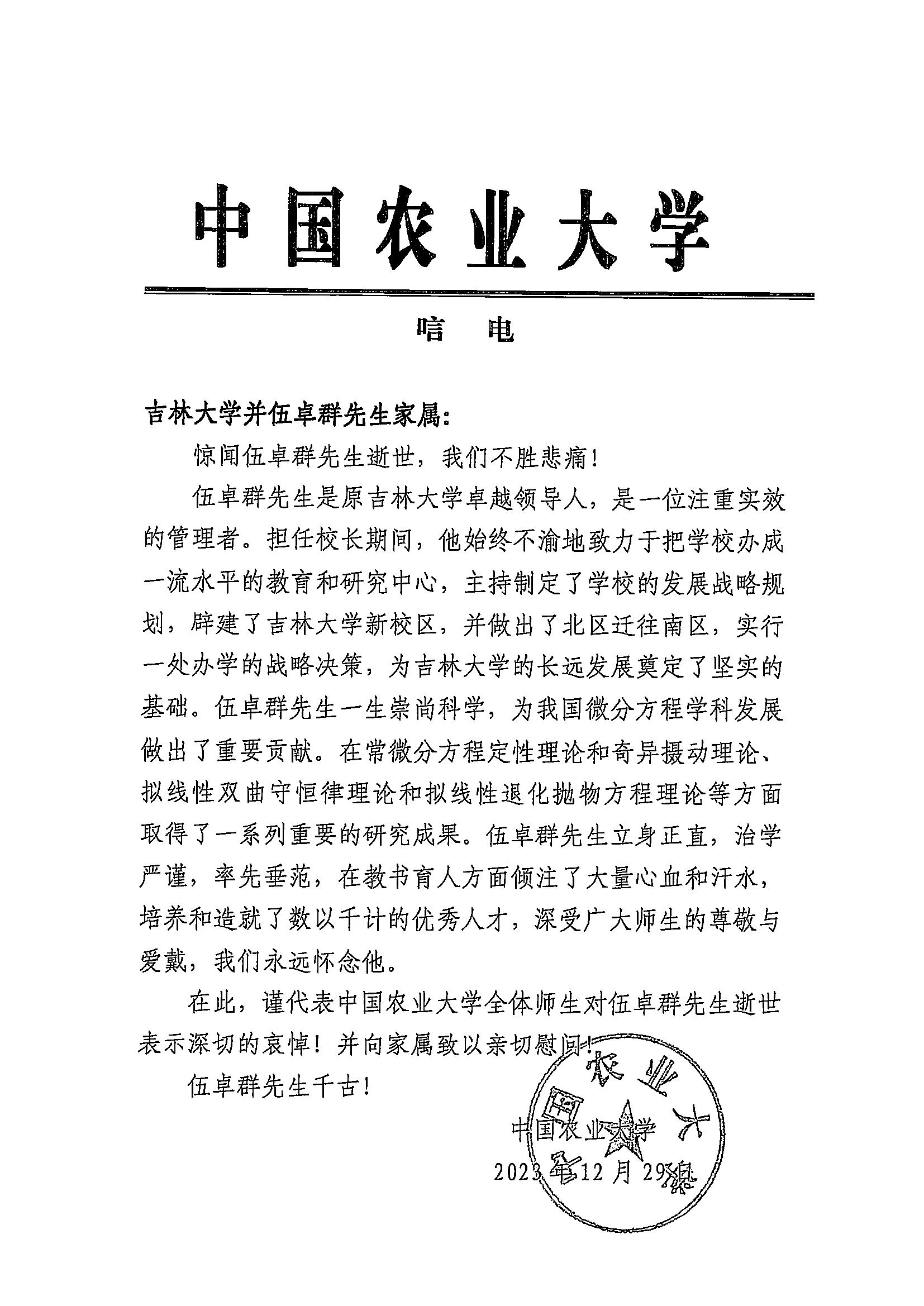 中国农业大学唁电
