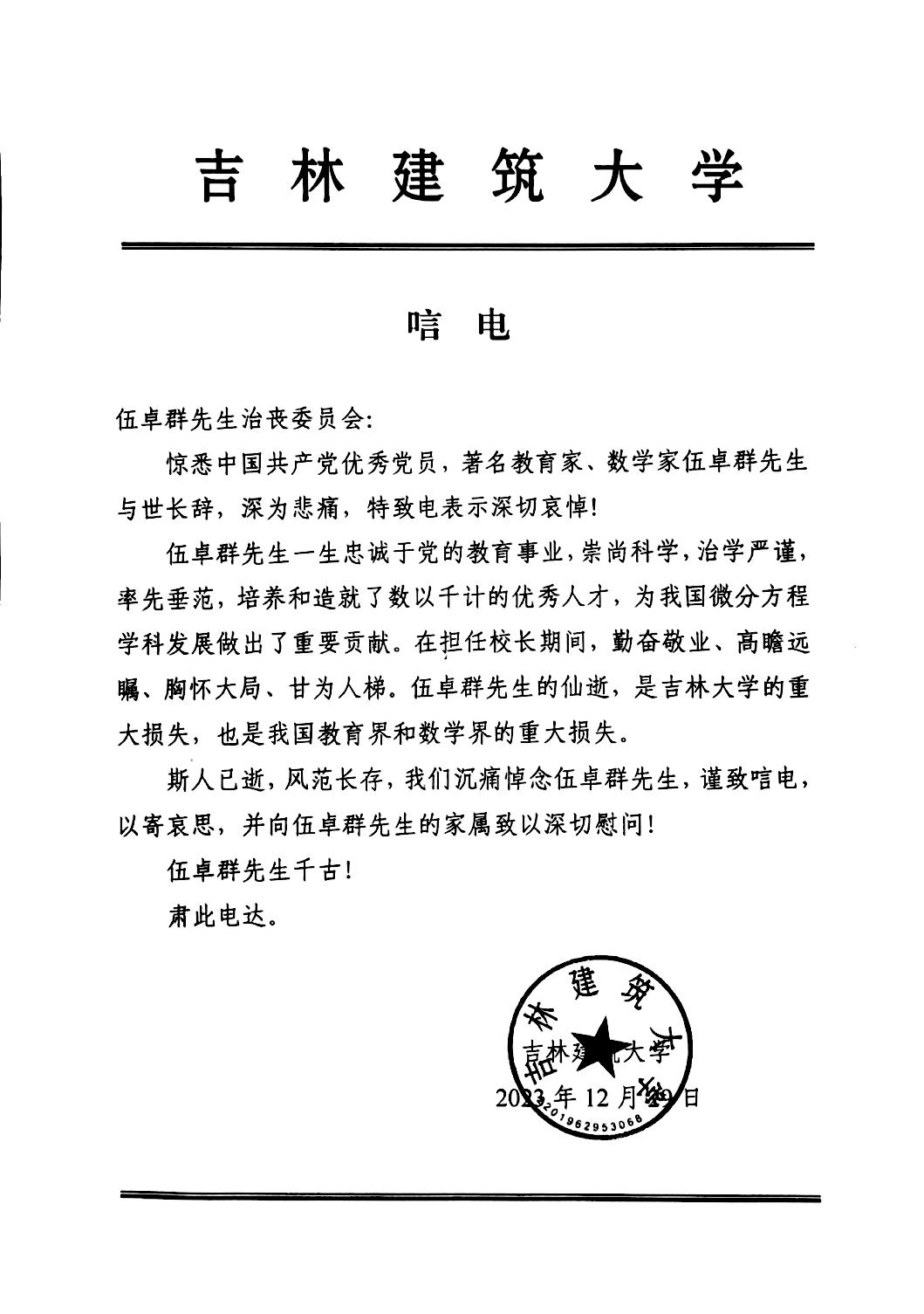 吉林建筑大学唁电