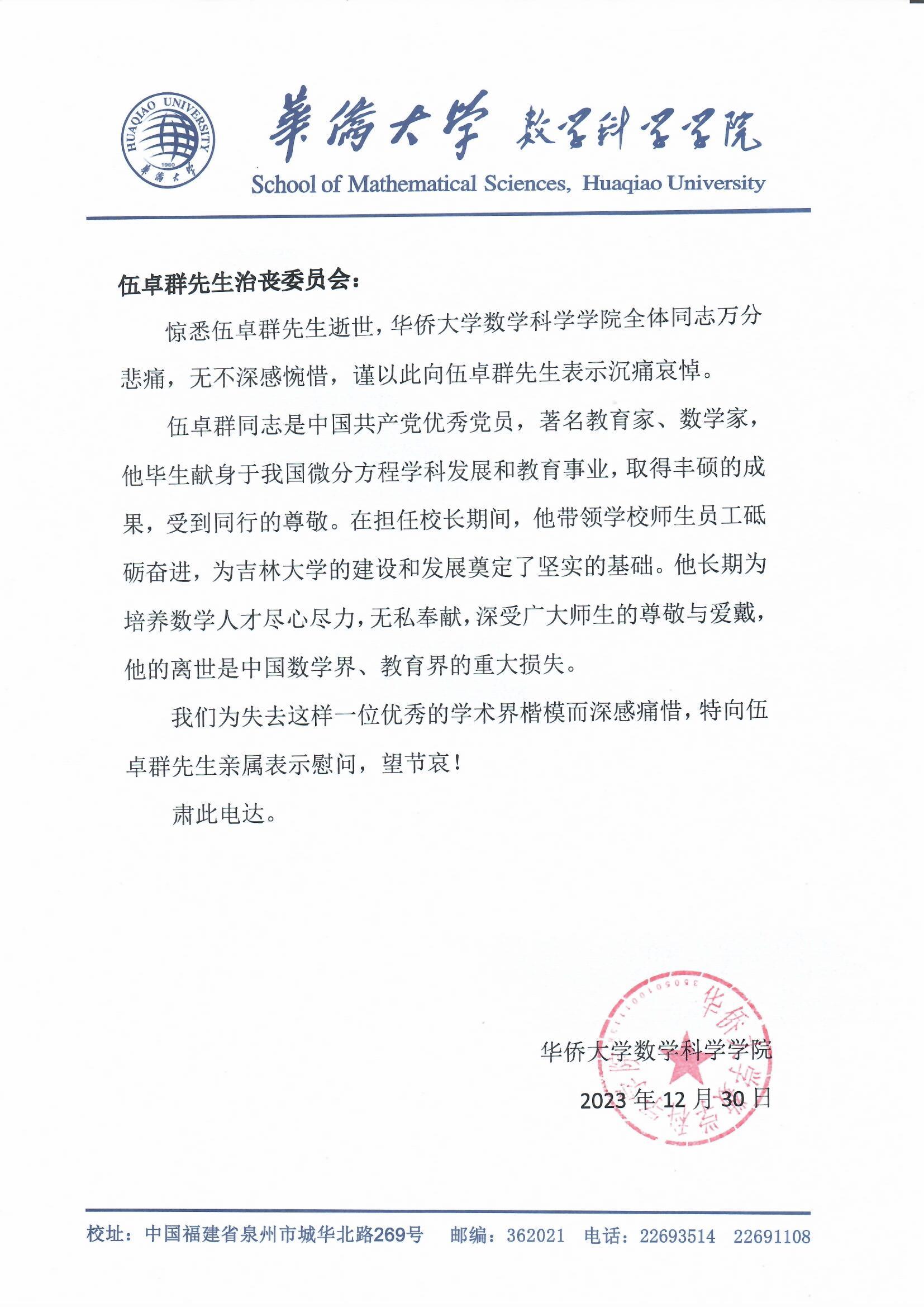 华侨大学数学科学学院唁电