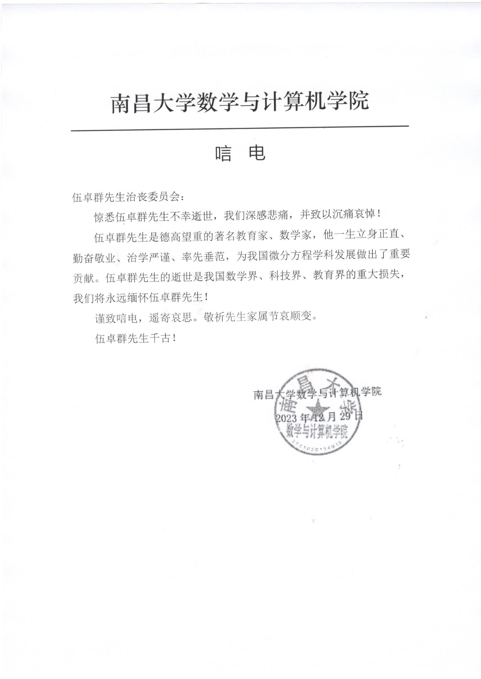 南昌大学数学与计算机学院唁电