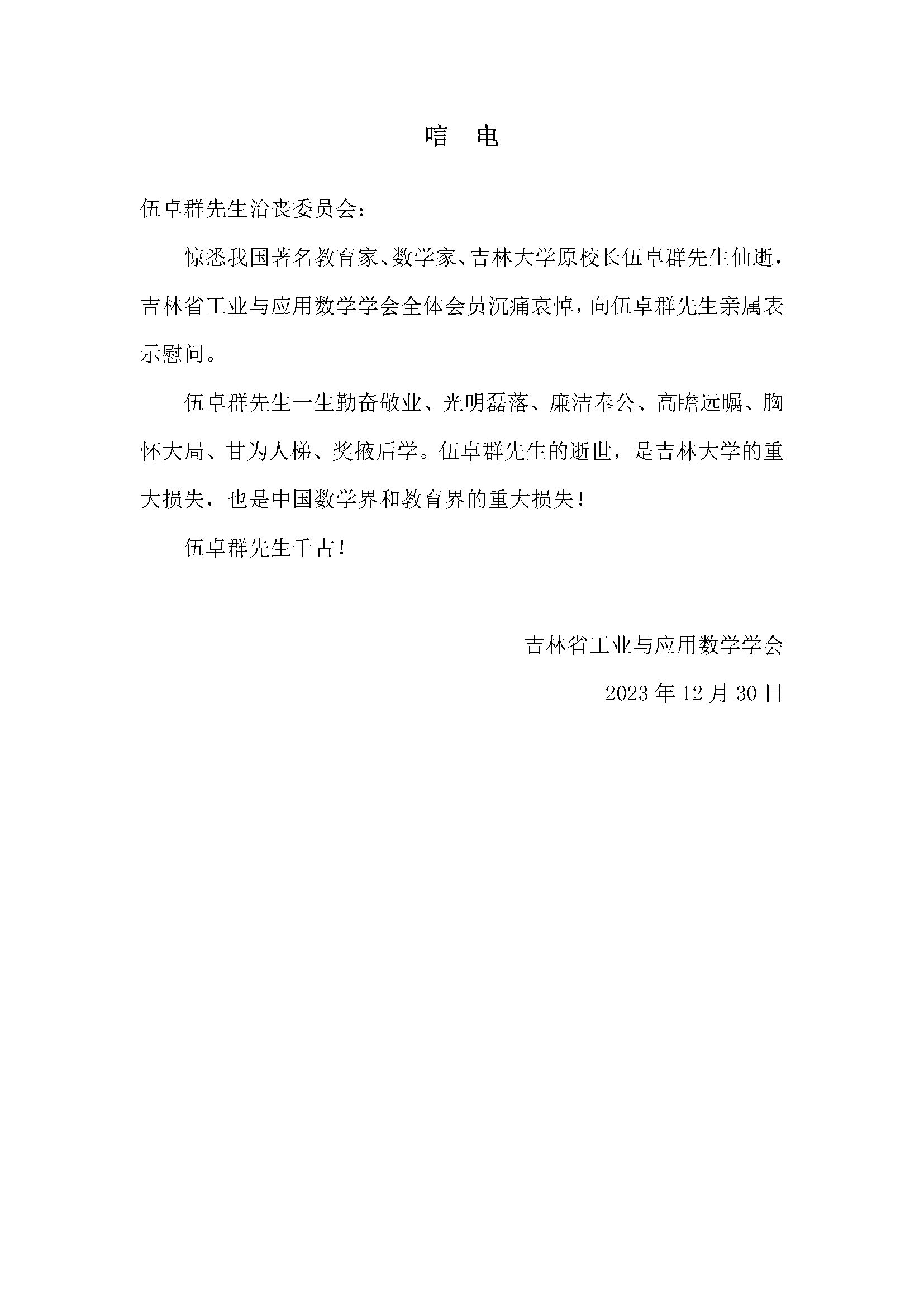 吉林省工业与应用数学学会唁电